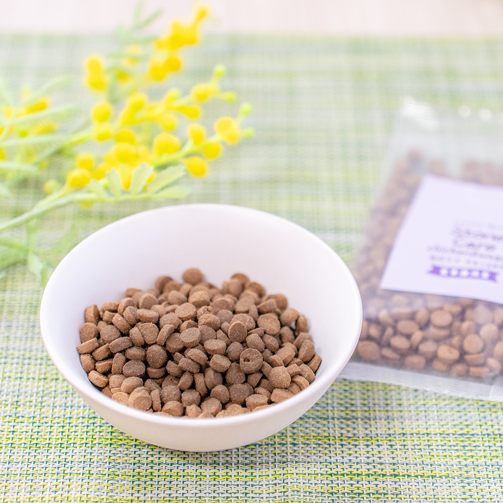 ■原材料(原材料原産国):海魚(サバ、イワシ、カツオ)(日本)、精製白米(日本)、タピオカスターチ(タイ)、酵母(日本)、濃縮大豆たんぱく質(オランダ)、大豆油(日本)、鶏脂肪(日本)、セルロース(日本)、レシチン(日本)、ビートファイバー(日本)、酵素分解チキンレバーエキス(日本)、牛脂肪(日本)、マグロ油(日本)、リン酸カルシウム(日本)、オリゴ糖(日本)、海塩(日本)、塩化カリウム(日本)、炭酸カルシウム(日本)、クランベリー(日本)、タウリン(日本)、昆布(日本)、ビタミンC(日本)、グルコン酸亜鉛(日本)、N-アセチルグルコサミン(日本)、ビフィズス菌(日本)、コンドロイチン硫酸塩(日本)、ピロリン酸鉄(日本)、ビタミンE(日本)、フェカリス菌(日本)、ナイアシン(日本)、グルコン酸銅(日本)、パントテン酸カルシウム(日本)、塩酸チアミン(日本)、塩酸ピリドキシン(日本)、リボフラビン(日本)、ビタミンA(日本)、葉酸(日本)、ビタミンB12(日本)